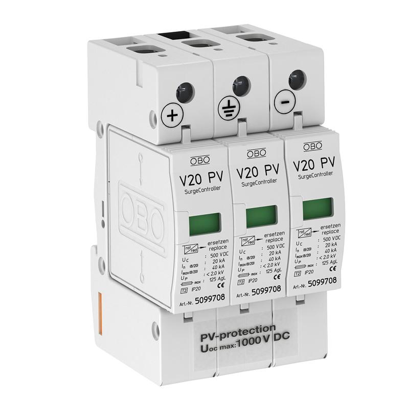 سرج ارستر فتوولتاییک کلاس C مدل V20-C 3-PH-1000 با کد فنی 5094608 ازجمله ارستر های سولار سه پل جهت حفاظت اینورتر با حداکثر ولتاژ 1000 ولت مستقیم می باشد.سرج ارستر 5094608 حفاظت در برابر اضافه جریان سوییچینگ (8/20μS) را حداکثر تا 40 کیلوآمپر انجام می دهد.سطح حفاظت ولتاژ ارستر V20-C 3-PH-1000 کمتر از 4KV می باشد.