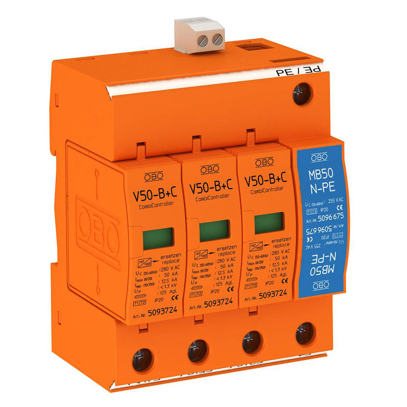 سرج ارستر کلاس ترکیبی B+C مدل V50-B+C 3+NPE+FS با کد فنی 593662 یکی از پرفروشترین ارسترهای 50KA شرکت OBO با ظاهری کلاسیک می باشد.