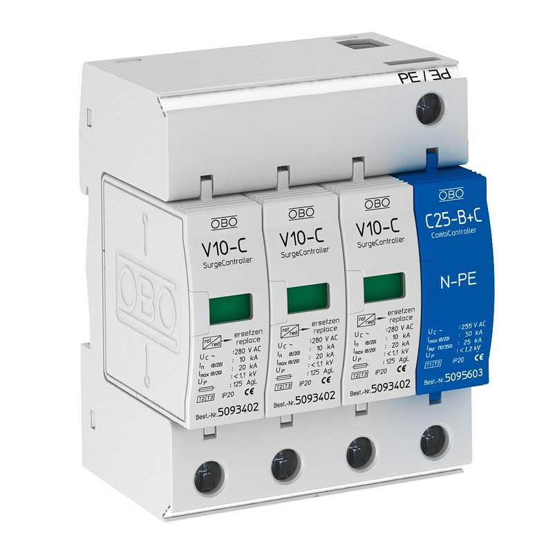 ارستر کلاس ترکیبی (C+D) نوع 3+2 مدل V10-C 3+NPE با کد فنی 5094920 یکی از کامل ترین ارسترهای سه فاز چهارپل ساخت شرکت OBO می باشد.طبق استاندارد، فاصله نصب بین دو ارستر کلاس C و D نباید کمتر از 5 متر باشد. رعایت این فاصله، مشکلاتی را در امور تابلو سازی ایجاد می کند که برای رفع آن، از ارسترهای کلاس ترکیبی C+D استفاده می شود.سرج ارستر 5094920 از سری V10 با تحمل جریان سوییچینگ حداکثر 40KA از زون 1 تا زون 3 حفاظت را انجام می دهد.