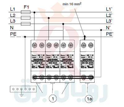 اتصال سرج ارستر کلاس B یا نوع 1 بصورت موازی با خط و ارتباط از طریق فیوز کاردی از نوع gL/gG انجام گیرد. حداکثر مقدار این فیوز توسط تولید کننده محصول بیان می شود.برای ارستر نوع 1 برند OBO این مقدار برابر با 500آمپر می باشد.با به توصیه سازنده چنانچه سایز کلید یا فیوز بالادست ارستر از این مقدار کمتر باشد نیازی به نصب فیوز پشتیبان نمی باشد.